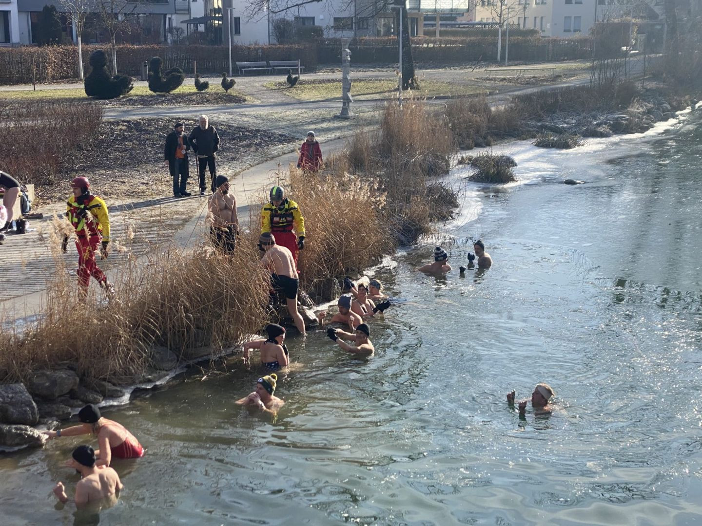 Trotz der sehr kalten Wassertemperatur begaben sich insgesamt ca. 35 Schwimmer in Badebekleidung in das kalte Nass.
