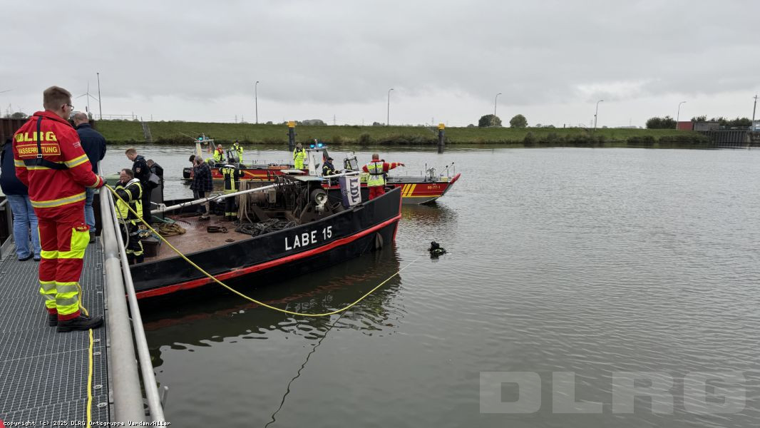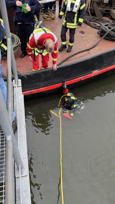 Auch durch die schlechte Sicht unter Wasser und die instabile Lage des Binnenschiffes bedingt, konnten unsere Taucher leider keine Schadstelle ausmachen.