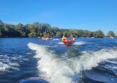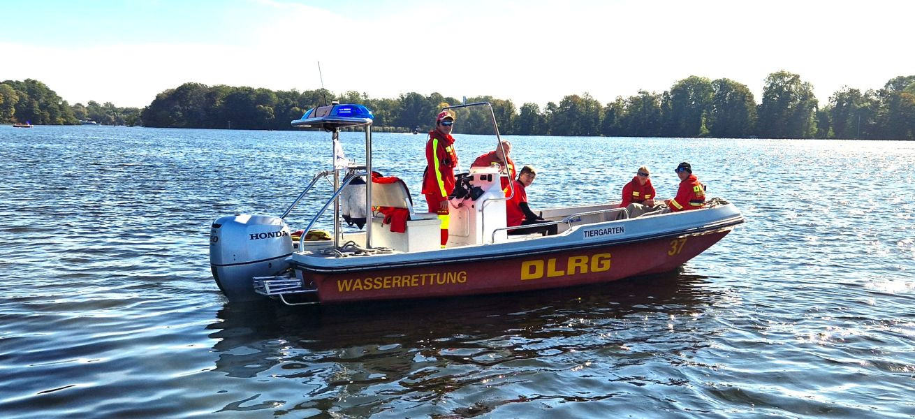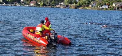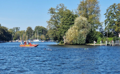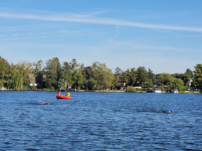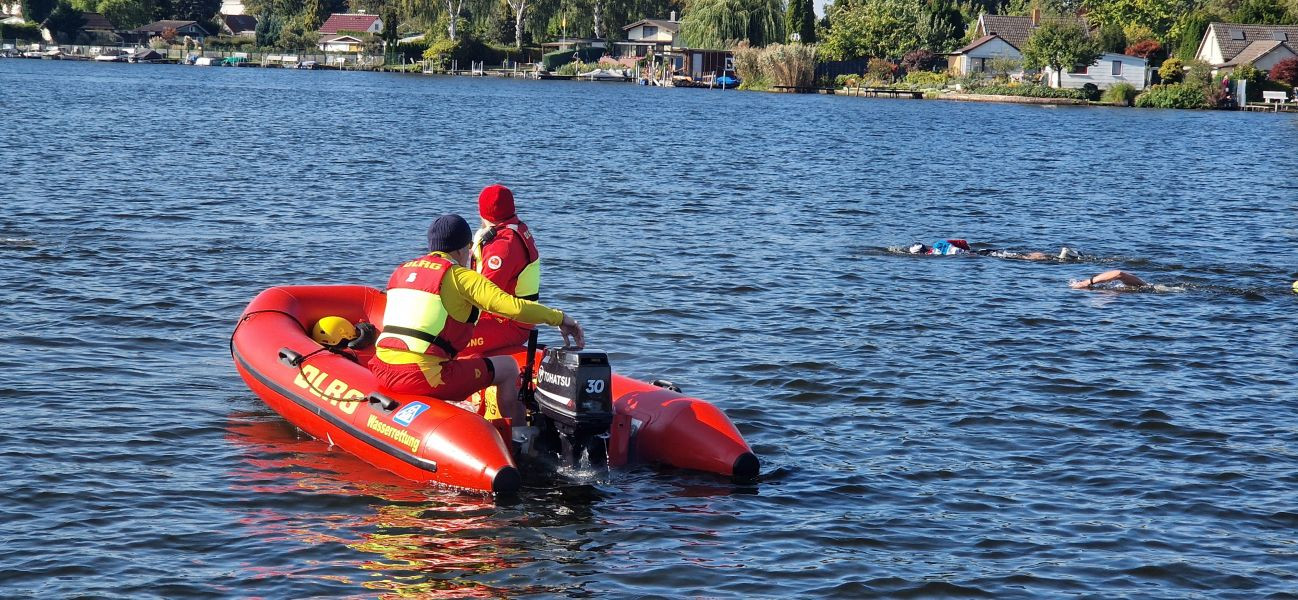 Viele DLRG Einsatzkräfte sorgten an beiden Tagen für Sicherheit auf dem Wasser . Der ein odere andere Sportler benötigte die Hilfe von Berlins Wasserrettern.
