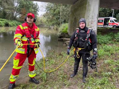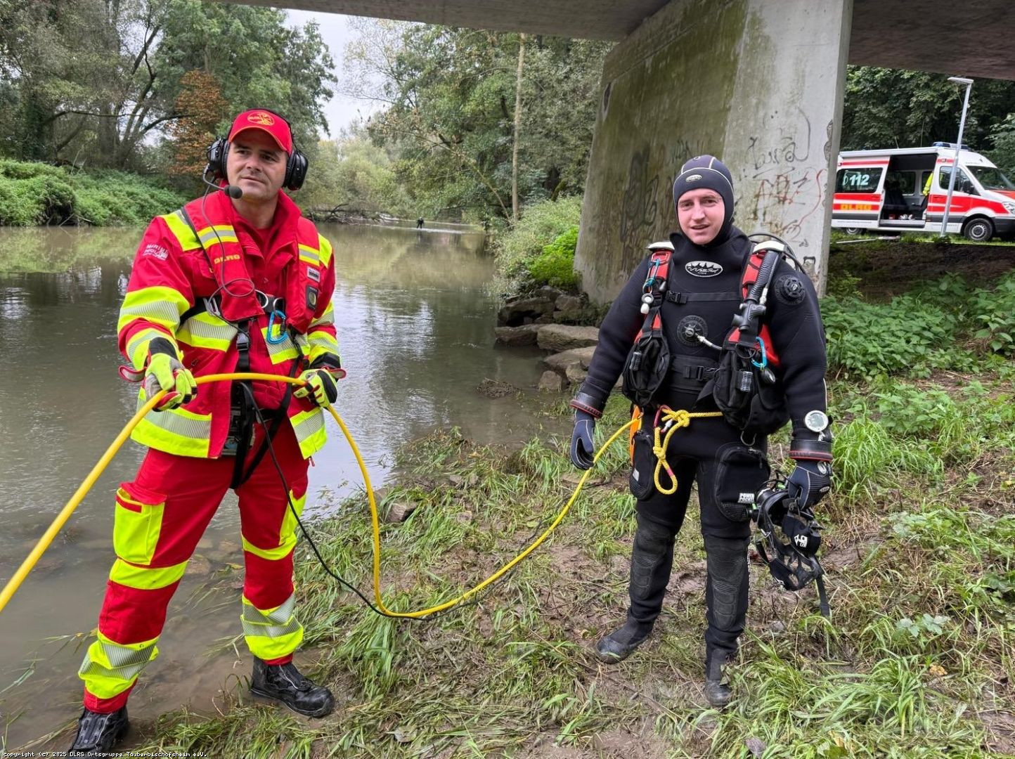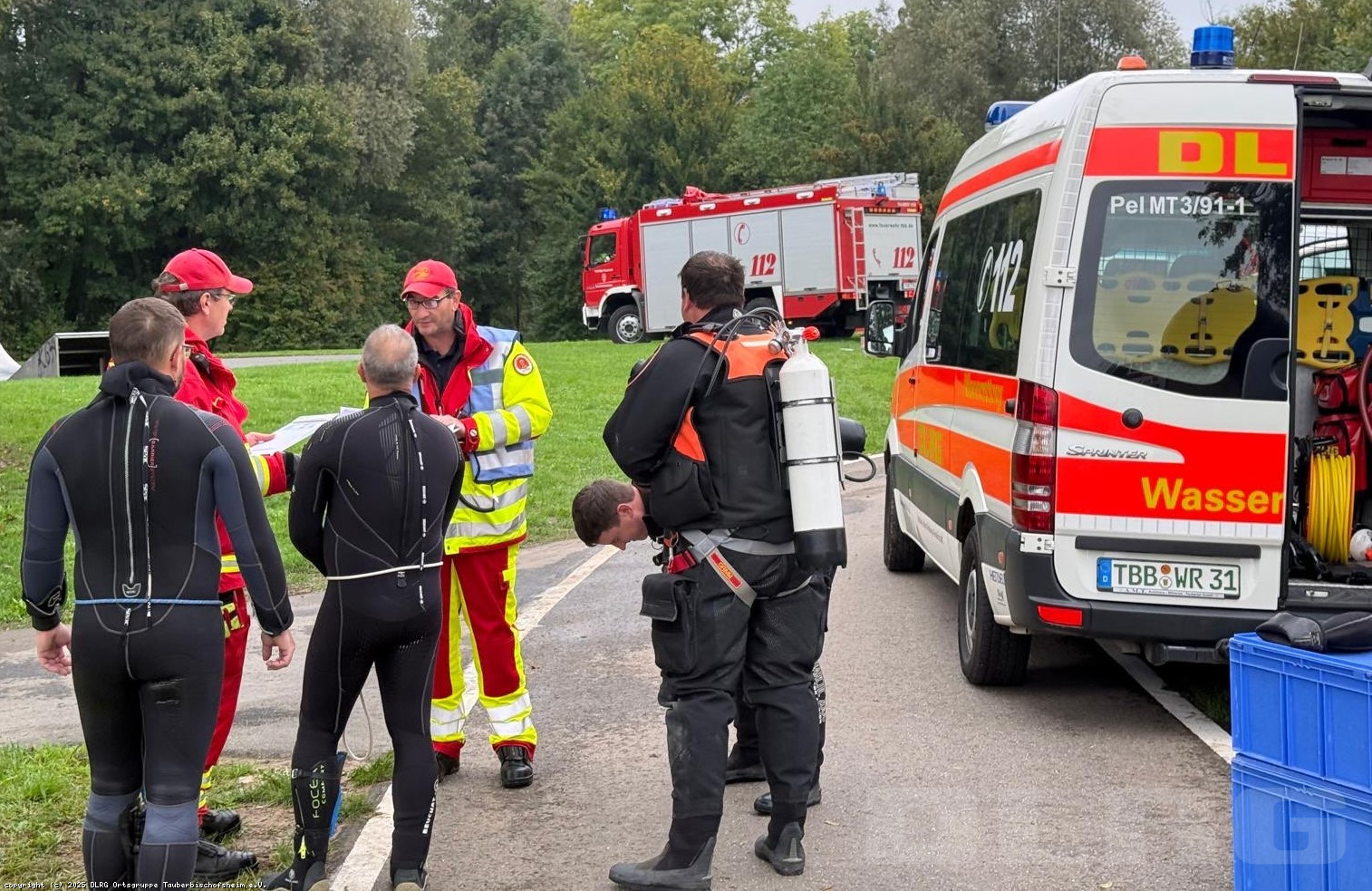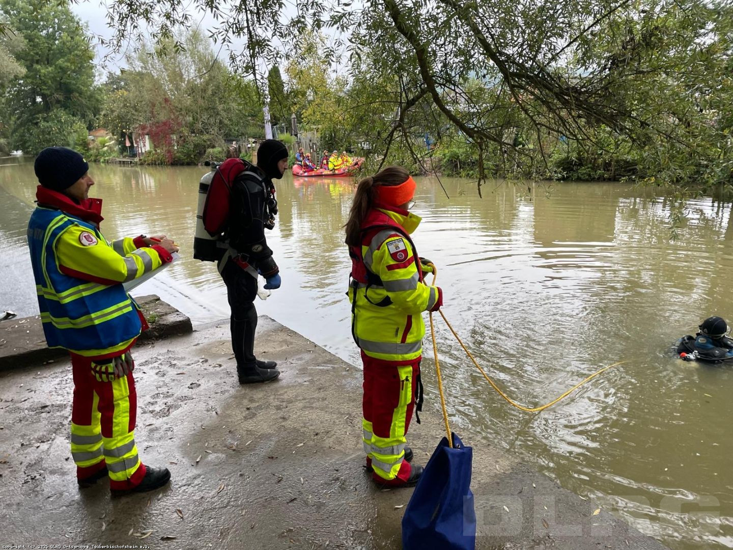 Durch die ILS Main-Tauber wurde daraufhin gemäß Alarm- und Ausrückeordnung die DLRG Gruppen Tauberbischofsheim und Königshofen sowie Feuerwehren und Rettungsdienst alarmiert. Bereits auf der Anfahrt konnte uns die ersteintreffende DLRG Königshofen via Digitalfunk eine erste Lagemeldung geben. Vor Ort wurde ein Tauchtrupp und ein Suchtrupp zusammengestellt. Die Drohne der Königshöfer DLRG kam ebenso zum Einsatz.