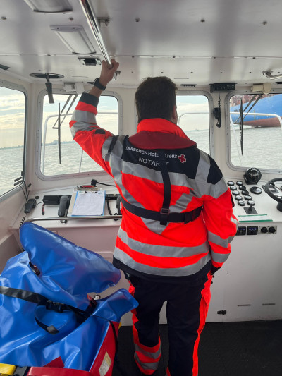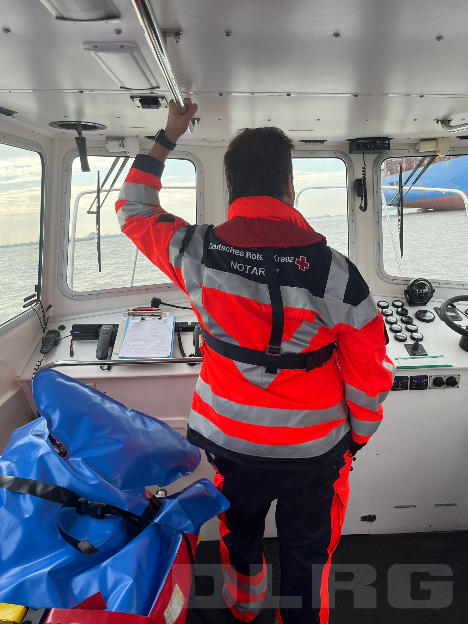 Die Übergabe an den Landrettungsdienst erfolgte auf dem Wasserweg. Die DLRG begleitete den Ablauf und brachte den Notarzt anschließend zurück zum Anleger in Stade.