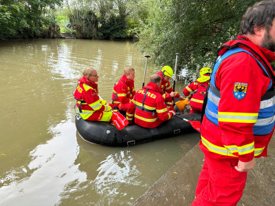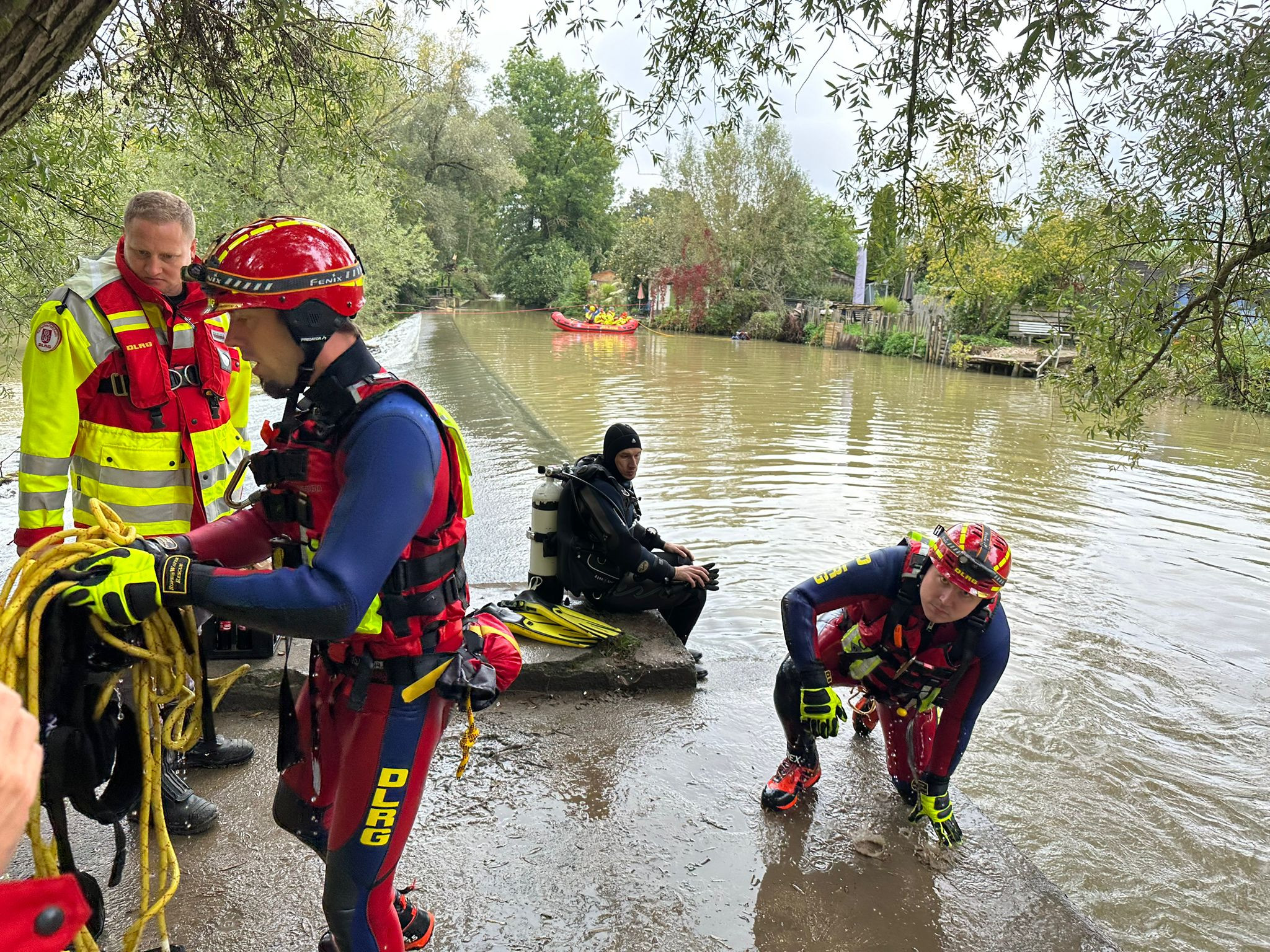 Die Gruppe Freudenberg stellte einen Tauchtrupp der im Unterwasser des Wehrs einen Bereich absuchte, eine Schlauchbootbesatzung für die Wasserortungshunde samt Hundeführern die im Mühlkanal suchten und Strömungsretter zur weiteren Suche und Absicherung.