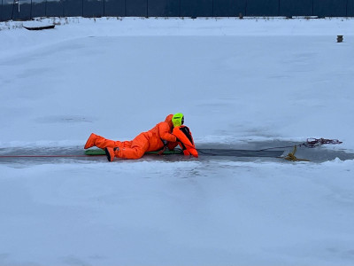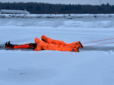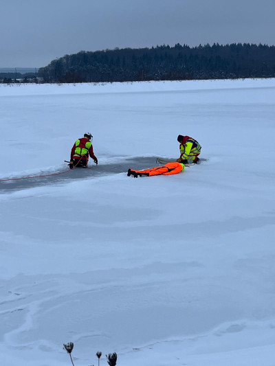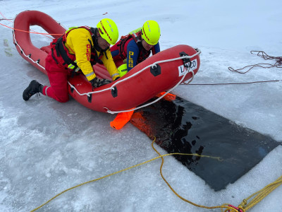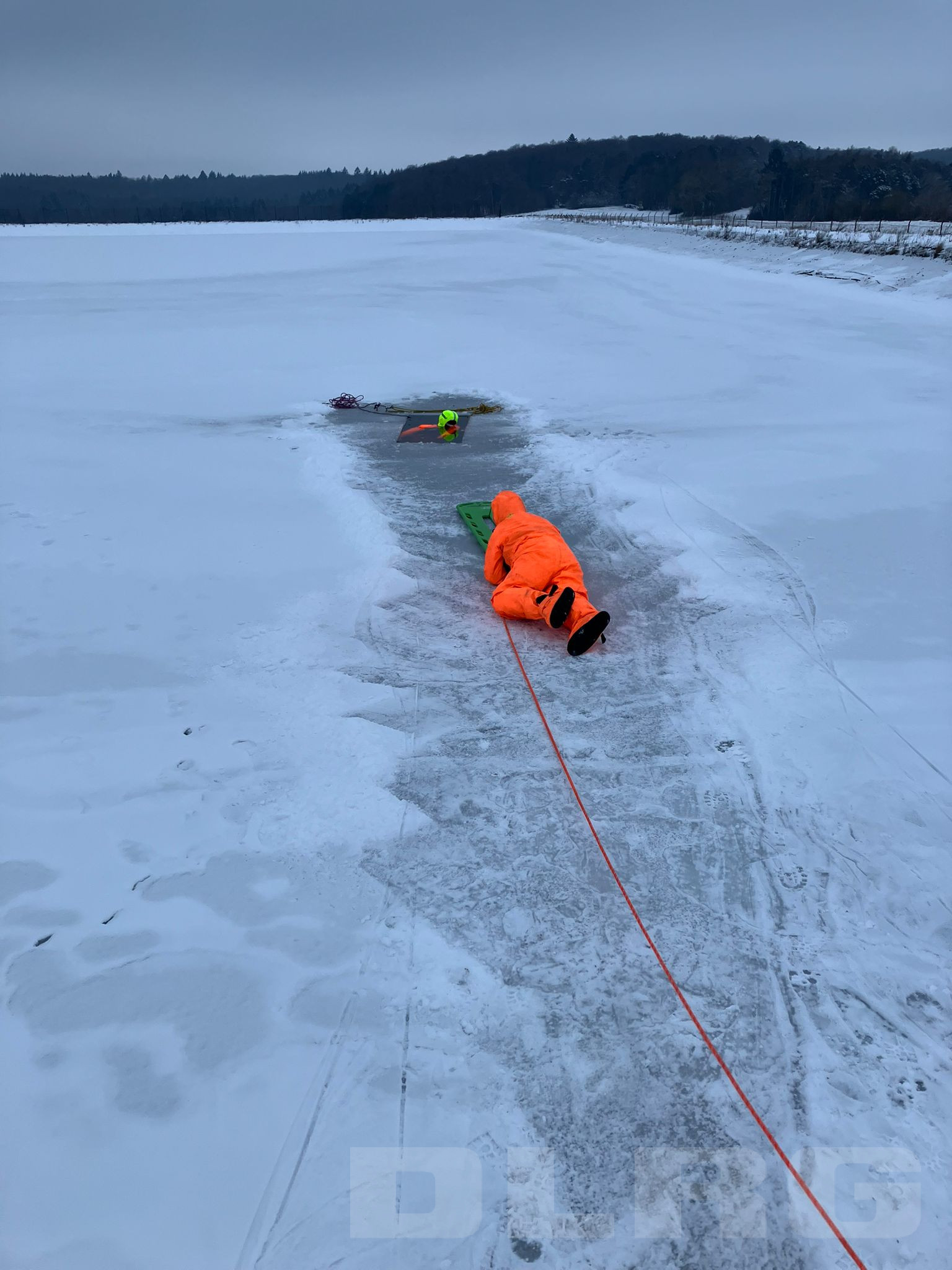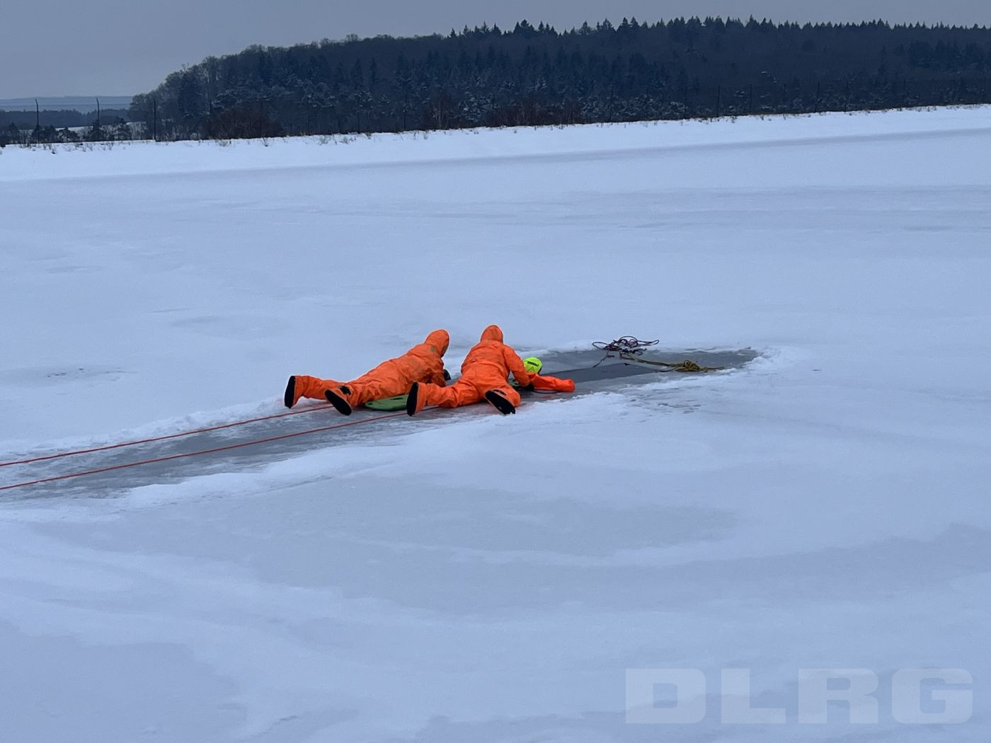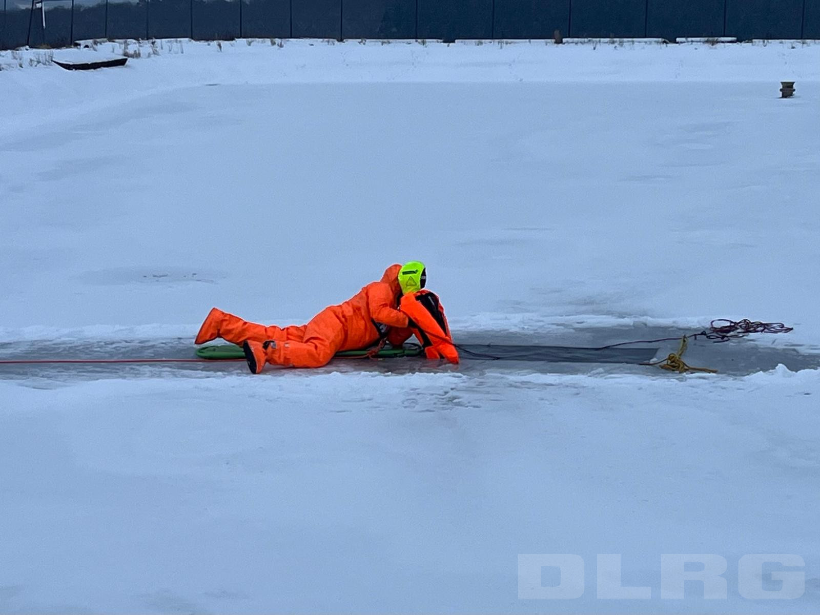Hierbei wurden gängigen Eisrettungsmittel der DLRG getestet und das Personal entsprechend auf die Möglichkeiten mit Eisrettungsschlitten, Combicarrier/Spineboard in unserem Versorgungsbereich geschult.