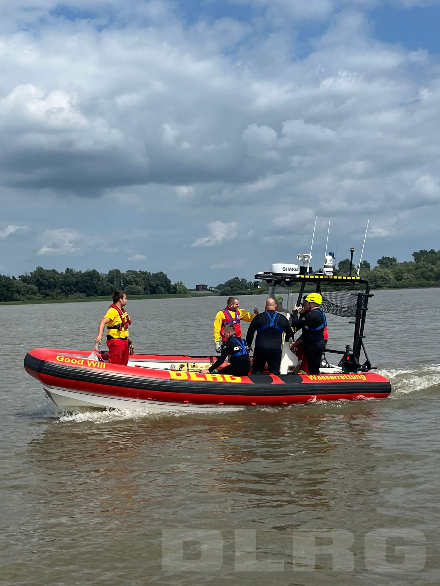 Parallel wurden Schwimmer im Neoprenanzug nachalarmiert um weiteres Material zur Einsatzstelle zu bringen und bei der Bergung zu unterstützen. Die Hebekissen konnten durch die Kräfte der DLRG Stade sicher befestigt werden. Gegen 16:30 Uhr schwamm die Yacht langsam wieder auf und wurde im Anschluss durch das Boot Kiek Ut in den Wedeler Hafen geschleppt.