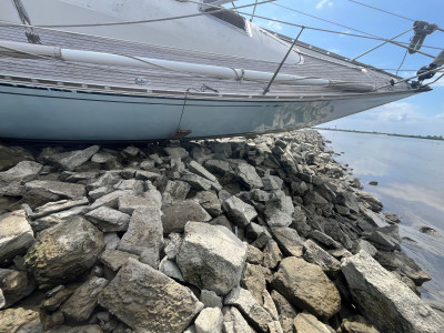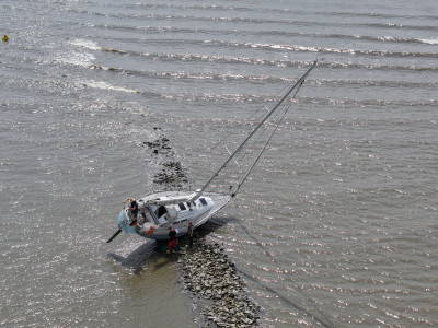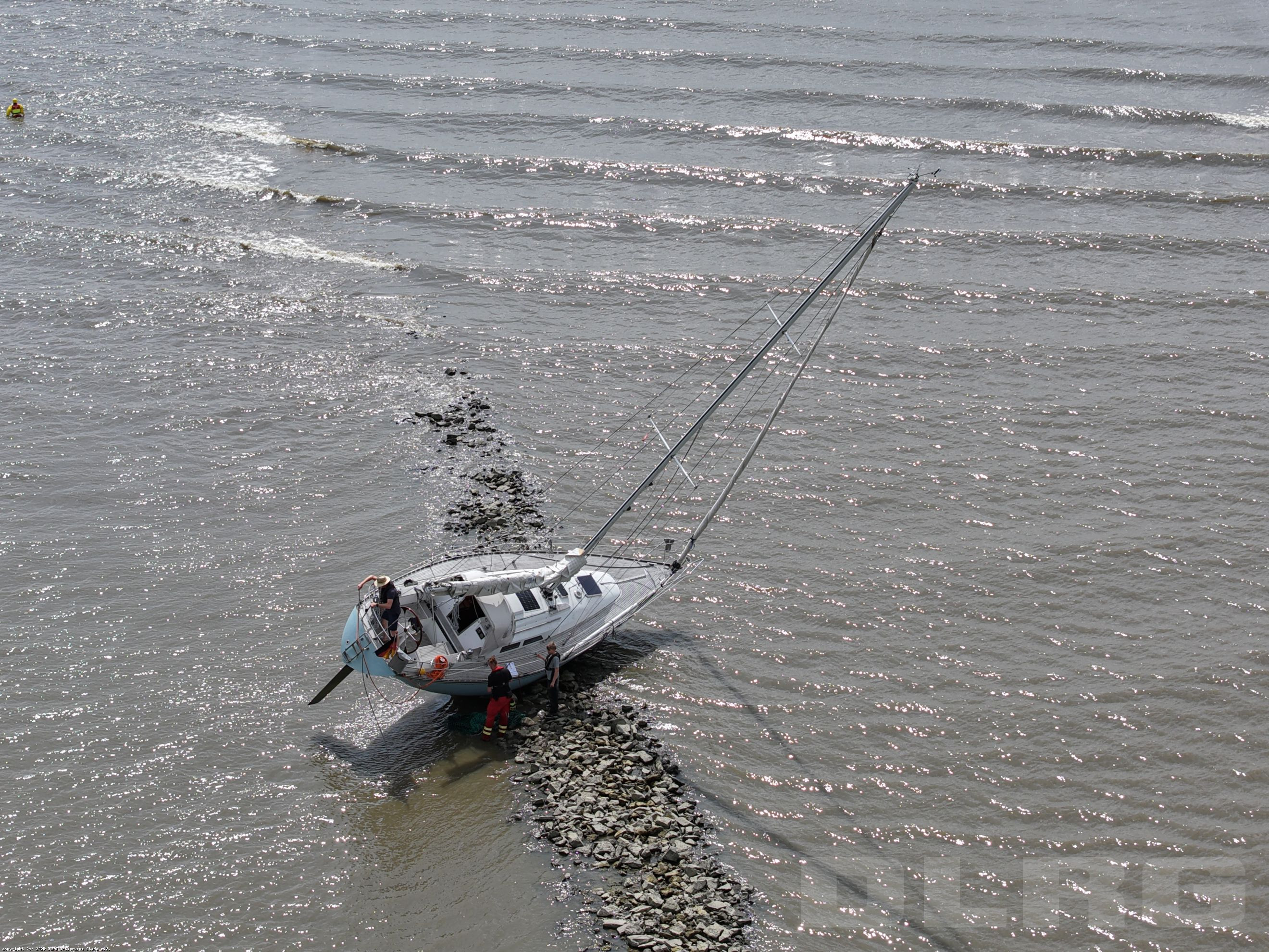 Absicherung eines, auf einen Steindamm aufgelaufenen Segelbootes gegen Abrutschen, Vermeidung weiterer Schäden am Bootsrumpf, Ünterstützung beim auftreiben umd schleppen in den Heimathafen.