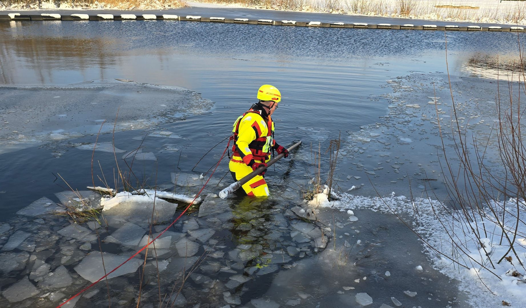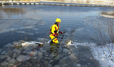 Gemeinsam mit der Feuerwehr Harsefeld wurde in einem Regenrückhaltebecken im Stubbenweg nach einem dort hineingerutschten und versunkenen Hund.gesucht.