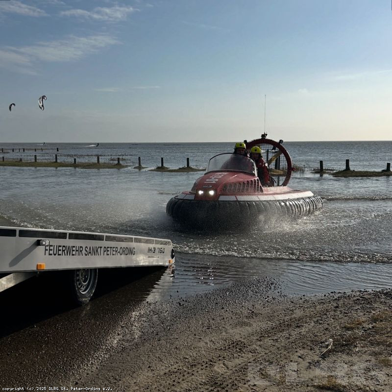 Am Freitagnachmittag (10.10.2025) sind drei Personen gemeldet worden, die sich in einer Notlage am Strand von St. Peter-Ording befinden sollten. Gemeinsam mit der Freiwilligen Feuerwehr rückten wir zum Südstrand aus. Dort konnte keine Feststellung gemacht werden, woraufhin an mehreren Stellen nach den Personen gesucht worden ist. Die Besatzung des Liftkissenbootes der Feuerwehr konnte die Personen zwischen Dünen und Vorland antreffen. Die höher aufgelaufene Flut hatte ihnen den ursprünglich angedachten Rückweg versperrt. Die Personen konnten den Weg nach etwas Unterstützung eigenständig fortsetzen.