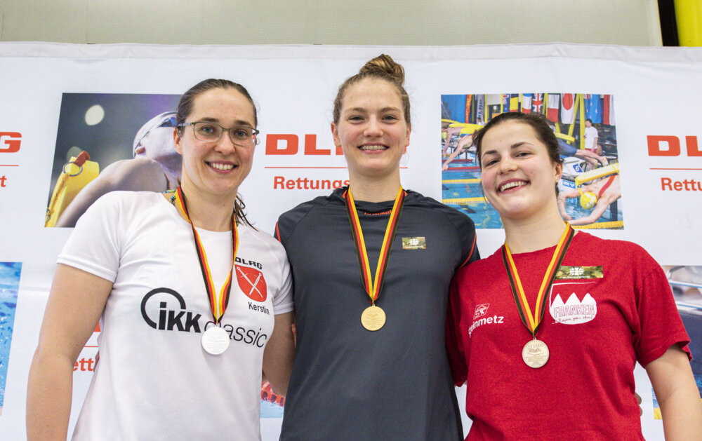 100m Manikin Carry with Fins: 2. Max Tesch, 1. Tim Brang, 3. Maximilian Ulrich. Foto: Steph Dittschar