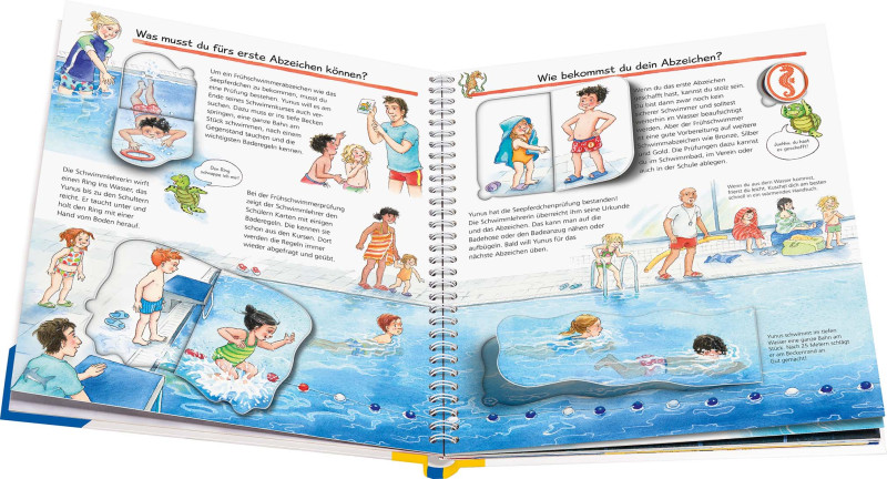 Für die DLRG war es selbstverständlich, an der Entwicklung des Buches mitzuwirken: „Schwimmen lernen ist ein wichtiges Thema bei Kindern und Eltern in diesem Alter. Umso mehr freut es uns, dass Ravensburger als renommierter Verlag das Thema aufgegriffen und in einer Kindersachbuch-Reihe verarbeitet hat“, so der Leiter Ausbildung im Präsidium der DLRG, Christian Landsberg. Das neue Kindersachbuch erzählt auf 16 Seiten, mit detailreichen Bildern, in leicht verständlichen Sachtexten und hinter vielen zusätzlichen Entdeckerklappen Wissenswertes über das Schwimmen. Beim Vorlesen oder Selberlesen begleiten Kinder ab vier Jahren den Protagonisten Yunus und seine kleine Schwester Aliza bei ihren Schwimmabenteuern. Sie lernen, dass immer ein Erwachsener in der Nähe sein muss, solange ein Kind noch nicht sicher schwimmen kann – auch wenn es Schwimmflügel trägt. Oder, dass Schwimmen zwar hungrig und durstig macht, aber nicht direkt vor dem Schwimmen gegessen werden sollte. Auch der erste Schwimmkurs wird sehr einfühlsam thematisiert und es wird auf die Ängste und Unsicherheiten vieler Kinder eingegangen, die oftmals noch an das Wasser gewöhnt werden müssen. Die Schwimmbewegungen beim Brustschwimmen werden genau gezeigt und beschrieben – auch für Trockenübungen zuhause. Eine Doppelseite widmet sich zudem dem Baden am Meer, dort zu findenden Verbotsschildern und möglichen Gefahren. Abgerundet wird der Wissens- und Entdeckerspaß durch ein großes und für Kinder ebenfalls besonders spannendes Wissensquiz.