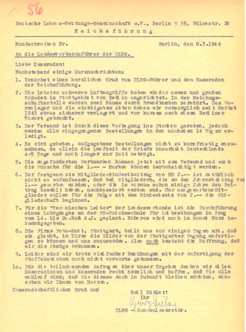 „Wenn Euch unser 4. Kriegs-Rundbrief erreicht, haben wir überall von den Sommerbädern Abschied genommen. Die Lehrgangsarbeit war in diesem Sommer durch das ungünstige Wetter stark beeinflußt. Aber auch das Fehlen der alten, erfahrenen Lehrscheinkameraden, die heute durchweg an der Front stehen, machte sich stellenweise fühlbar bemerkbar. Viele Stunden ehrenamtlicher Dienst im Interesse der Volksgemeinschaft wurde von den Kameraden der Heimat übernommen. Mancher Schwimm- und Bademeister konnte aus den Reihen der DLRG gestellt werden. – Der Schluß des Sommers hat dennoch gut gemacht, was noch gut zu machen war. Und so können wir im großen und ganzen auf unsere Erfolge dennoch Stolz sein. Eine Anzahl von Werbeveranstaltungen wurden im Sommer im Bezirksgebiet durchgeführt, die unter Beweis stellen, daß die DLRG fest in der Front steht und zum Endsieg zu ihrem Teile beitragen will. Mit heißem Herzen sind wir trotz aller Kriegshemmnisse in Gedanken stets bei Euch. Wir sind bei Euch und halten zu Euch, wie Ihr stets zur Heimatfront haltet. Ihr seid uns Vorbild und Richtschnur. Die Heimatfront der DLRG entbietet Euch allen die kameradschaftlichsten Grüße und wünscht euch eine gesunde Heimkehr! […]“