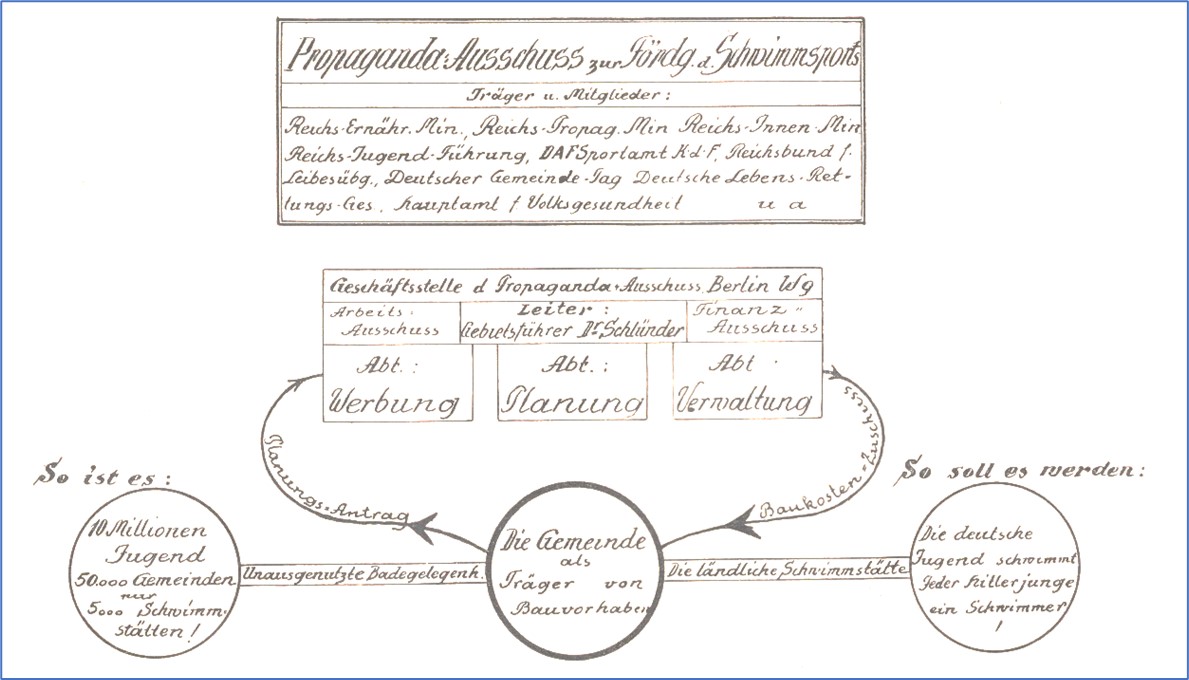 1937 wird die DLRG Mitglied im neugegründeten „Propaganda-Ausschuß zur Förderung des Schwimmsports“, der u. a. den Bäderbau in Deutschland fördert. Die Graphik zeigt die Organisationsstruktur dieses Ausschusses: